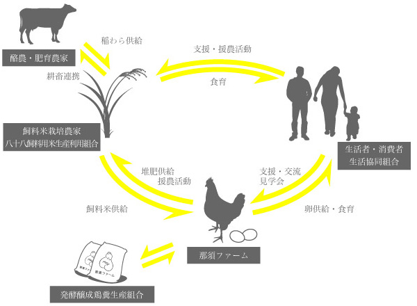 ※ 2009年3月に発足した協議会。飼料用米の栽培から卵の生産まで、米農家、畜産農家、生協など関係機関・団体が一丸となって取り組みました。2009年度内閣府「地方の元気再生事業」にも選ばれ、熊本県立大学も参画。卵の機能性調査や商品開発に取り組んでいます。