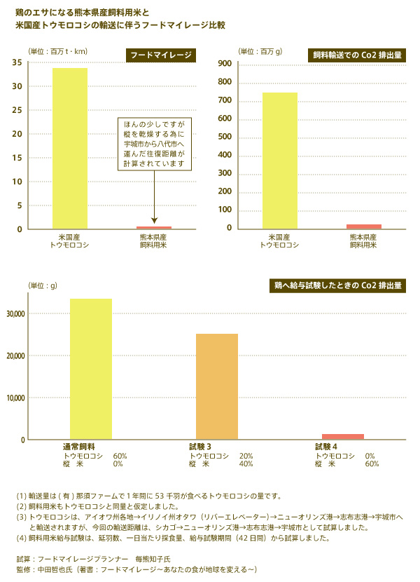 その点、八十八卵の鶏のエサは熊本県産飼料用米。地産のお米をエサにしているので、輸入飼料に比べるとCO2排出は少なく、フードマイレージもぐっと小さくなります。